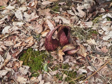 Skunk cabbage (Symplocarpus foetidus) flowers emerge from the ground in early spring before the leaves.